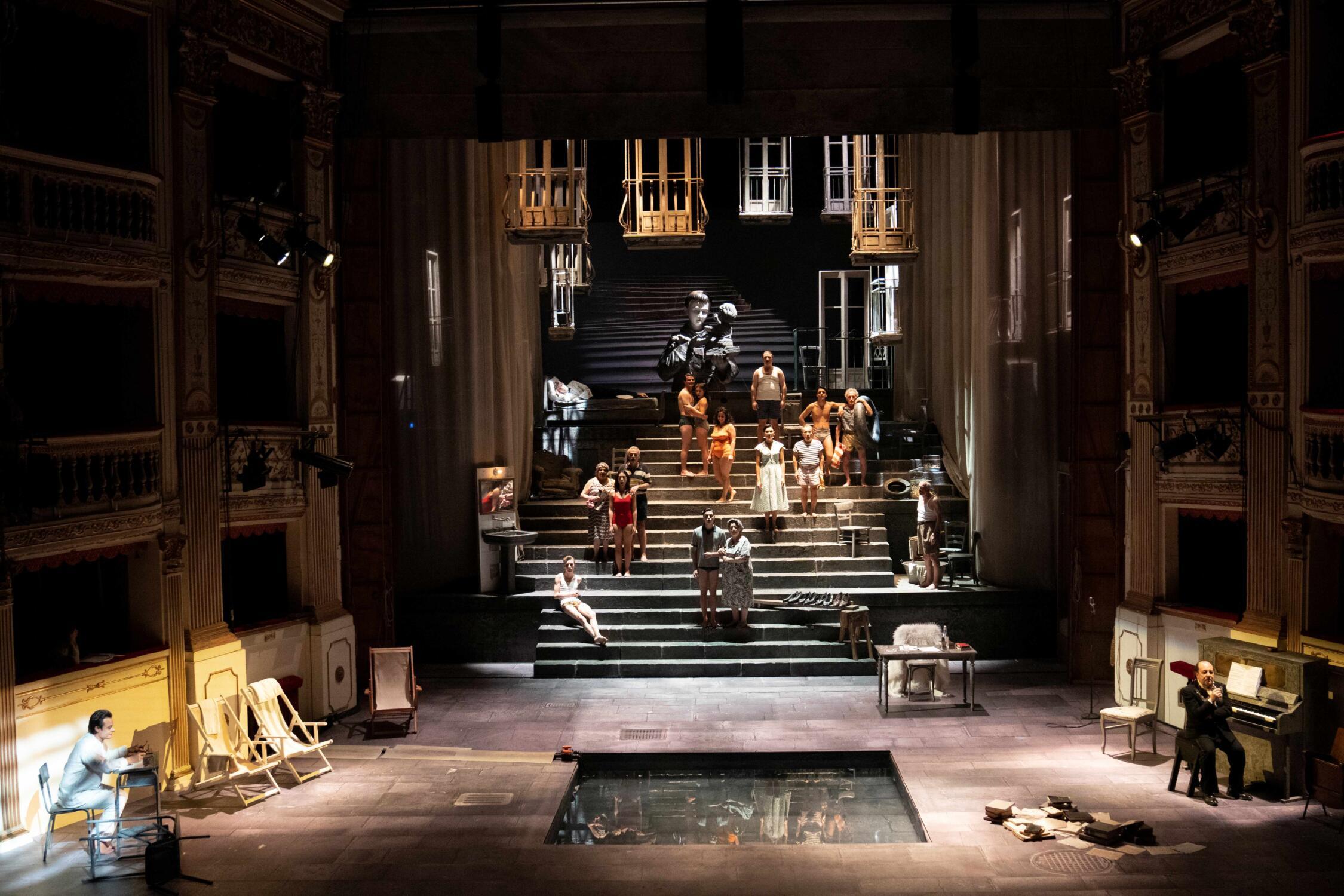 As the protagonist continues his stroll through Naples, music and song play an increasingly important role. About twenty figures can be seen sitting on the upstage steps, and every now and then, one of them bursts into a popular Neapolitan song. Moscato’s musical tastes, though, are eclectic; Lou Reed’s On the Wildside jostles for our attention alongside Elvis Presley’s Rock Around the Clock. As the latter blasts out, the large cast move downstage close to the audience, letting their hair down and jiving madly. Then, rapidly, the mood changes, as Moscato moves downstage to visit the famous Bagni Eldorado (The Eldorado swimming baths). Here he pauses, quietly watching bathers enjoying themselves, splashing around in the water, having a drink and flirting. It was here, he remarks, that in the 1960s famous artists and working-class Neapolitans used to mingle. With a touch of nostalgia, he adds that this could no longer happen today. The Naples he knew as a boy, which was chaotic, variegated and had boundless humanity, no longer exists.