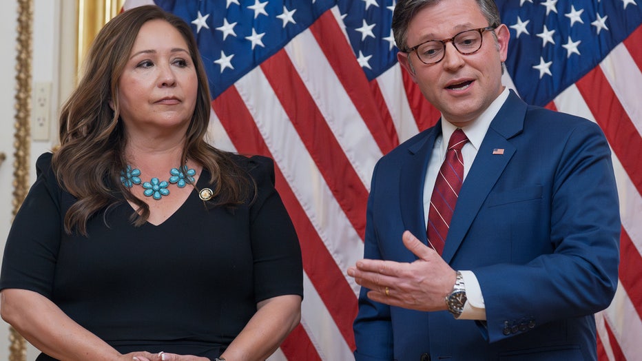 Speaker of the House Mike Johnson, R-La., holds a ceremonial swearing-in for Rep. Adelita Grijalva, D-Ariz., left, who won the special election on Sept. 23 to replace her late father, Rep. Raul Grijalva, D-Ariz., at the Capitol in Washington, Wednesd