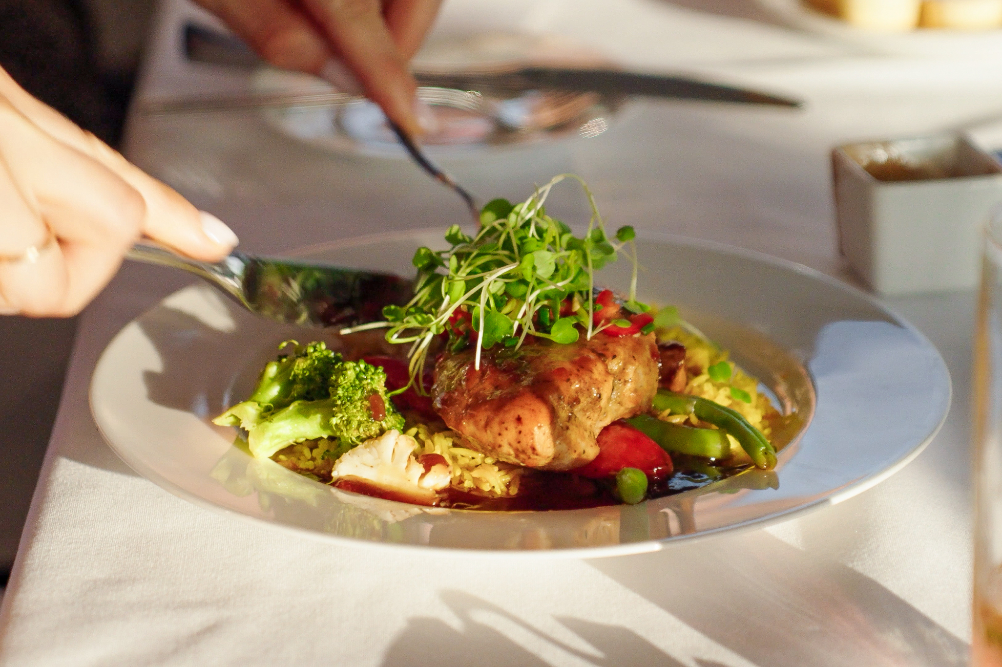 We started with dinner in the dining room, where the friendly crew helped us snag a cozy window-side table. You do have to pay an extra $25 for those, but trust us, the views are totally worth it! The menu offers classic seasonal fare with a twist, including vegetarian and vegan options that don’t taste like afterthoughts.